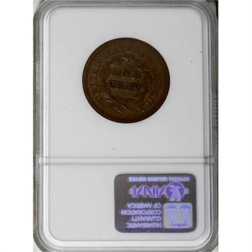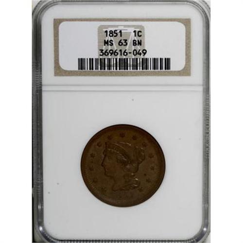 <B>1851 1C MS63 Brown NGC.</B></I> NGC Census: (106/376). PCGS Population (86/154). Mintage: 9,889,707. Numismedia Wsl. Price for NGC/PCGS coin in MS63: $200. (#1892)<BR><BR><B>Coin Engraver:</B> Christian Gobrecht<BR><BR><b>Shipping:</b> Coins & Currency (<a target="_blank" href="http://www.heritageauctions.com/common/shipping.php">view shipping information</a>\)