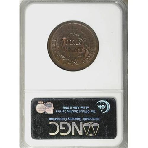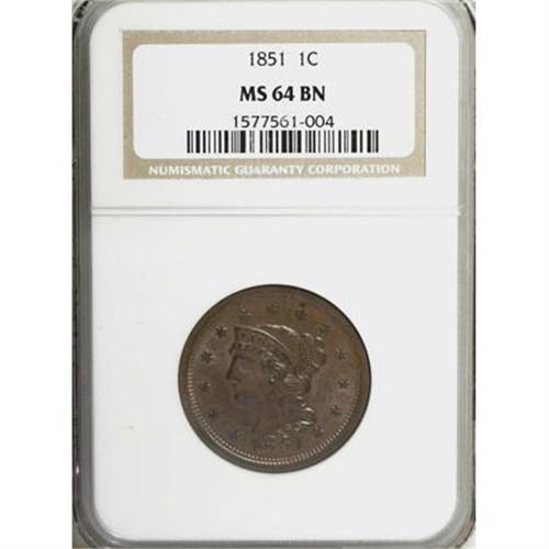 <B>1851 1C MS64 Brown NGC.</B></I> NGC Census: (154/226). PCGS Population (105/55). Mintage: 9,889,707. Numismedia Wsl. Price for NGC/PCGS coin in MS64: $352. (#1892)<BR><BR><B>Coin Engraver:</B> Christian Gobrecht<BR><BR><b>Shipping:</b> Coins & Currency (<a target="_blank" href="http://www.heritageauctions.com/common/shipping.php">view shipping information</a>)