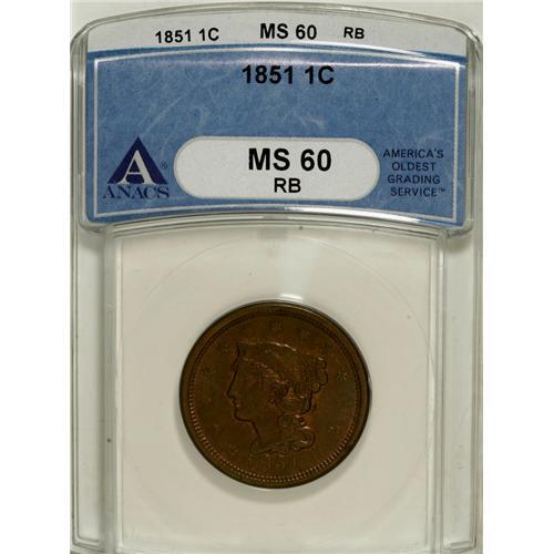 <B>1851 1C MS60 Red and Brown ANACS.</B></I> NGC Census: (0/246). PCGS Population (0/163). Mintage: 9,889,707. (#1893)<BR><BR><b>Shipping:</b> Coins & Currency (<a target="_blank" href="http://www.heritageauctions.com/common/shipping.php">view shipping information</a>)