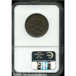 <table><tr><td><table><tr><td>1851 1C MS65 Brown NGC. N-25, R.3. Die state b. A mahogany-brown Gem that has glimpses of crimson color in protected areas. A crisply struck and beautifully preserved Gem that would charm even the most jaded specialist. Population: 2 in 65 Brown, 2 finer (3/04). <BR><BR><B>Important notice:</B> Heritage usually auctions material at the rate of 200-250 lots per hour. On some occasions eBay Live bid software or the Internet may not be able to keep up with the pace of the auction. We recommend placing a realistic absentee bid now as insurance to avoid disappointment. Occasionally the auctioneer may eliminate or reject an eBay Live bid, and the auctioneer may also reopen a lot after the close of the eBay live bidding (usually because we missed an audience bid), and may reject your bid even if it shows you as the winning bidder. By bidding via eBay Live, you agree that Heritage may award the lot to another bidder at its sole discretion under the circumstances described above or any other reasonable circumstances. Since eBay bids are not shown to us until we open the lot on the floor, we treat those bids just like floor bids. In most cases the floor responds before the eBay bid is presented to us, due to Internet lag time, so for consistency we have made it a policy that floor bids are always considered first over tie eBay live bids. Also please note that all Heritage lots purchased through eBay Live carry a 20% Buyer's Premium. Please make sure you read the Terms and Conditions before you bid. <BR><BR><B>IMPORTANT ANNOUNCEMENT ABOUT RESERVES:</B> Heritage now divulges all reserves on its web site 7 days before every auction. If you want to know whether the reserve on this lot has been met, and if not, what the reserve amount is, please visit this lot page on the HeritageCoin.com web site, or email: bid@HeritageGalleries.com </span></font></td></tr></table></td></tr></table>