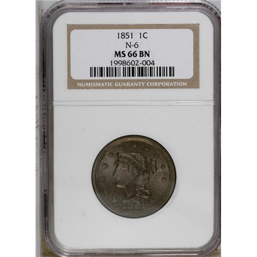 <B>1851<1C> MS66 Brown NGC.</B></I> N-6, R.1. This is a splendid, sharply struck specimen with fully lustrous medium brown color and frosty surfaces. Tinges of original red appear on the reverse, but not in significant quantity. A pleasing example, especially suited for the date or type collector. EAC 60.