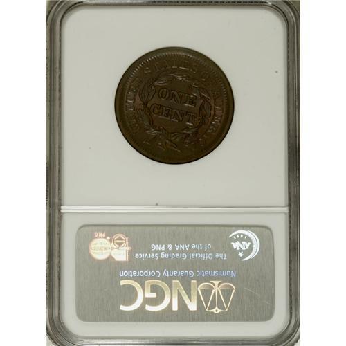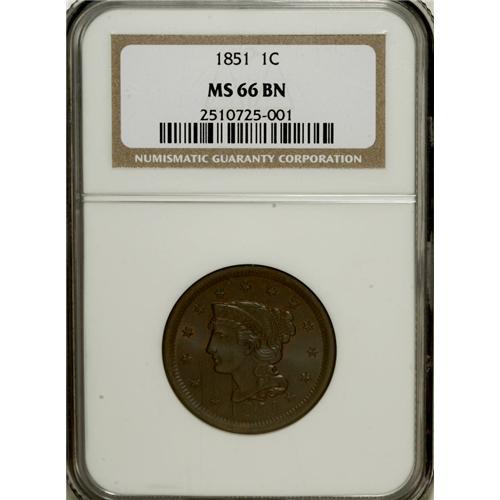 <B>1851 1C MS66 Brown NGC.</B></I> N-7, R.1. This splendid Premium Gem possesses vibrant cartwheel luster, and is attractively toned ebony-brown. Hints of faded mint red reside near design crevices. Unabraded and impressive. EAC 60.<BR><BR><b>Shipping:</b> Coins & Currency (<a target="_blank" href="http://www.heritageauctions.com/common/shipping.php">view shipping information</a>)