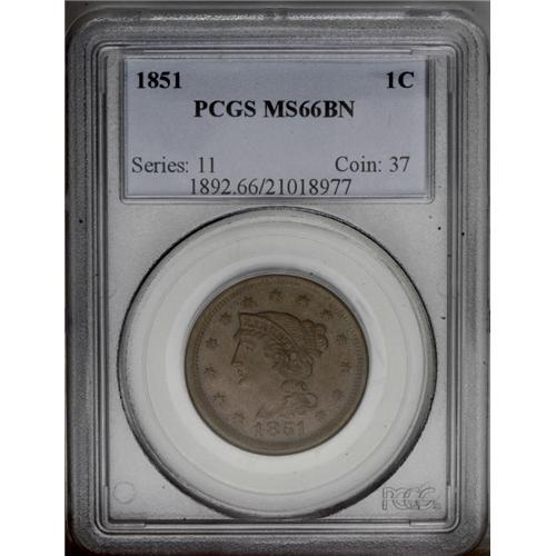 <B>1851<1C> MS66 Brown PCGS.</B></I> N-20, R.3+. Die State c. A late die state of this variety, formerly called N-28, with the top of C and E joined by die crumbling. Radial flowlines are visible close to the border on both sides. Lustrous surfaces with lovely olive-brown color and tinges of mint red. This example is in or near the Condition Census for the variety and finer than any of the late die state coins in the Brown collection. EAC 60. <BR><BR><B>Important notice:</B> Heritage usually auctions material at the rate of 200-250 lots per hour. On some occasions eBay Live bid software or the Internet may not be able to keep up with the pace of the auction. We recommend placing a realistic absentee bid now as insurance to avoid disappointment. Occasionally the auctioneer may eliminate or reject an eBay Live bid, and the auctioneer may also reopen a lot after the close of the eBay live bidding (usually because we missed an audience bid), and may reject your bid even if it shows you as the winning bidder. By bidding via eBay Live, you agree that Heritage may award the lot to another bidder at its sole discretion under the circumstances described above or any other reasonable circumstances. Since eBay bids are not shown to us until we open the lot on the floor, we treat those bids just like floor bids. In most cases the floor responds before the eBay bid is presented to us, due to Internet lag time, so for consistency we have made it a policy that floor bids are always considered first over tie eBay live bids. Also please note that all Heritage lots purchased through eBay Live carry a 20% Buyer's Premium. Please make sure you read the Terms and Conditions before you bid. This lot is being auctioned in conjunction with a live floor auction by Heritage Galleries & Auctioneers. All final auction and invoice information will be supplied by Heritage Galleries & Auctioneers, and all other information should be considered preliminary. Lot:320 <BR><BR><B>Winning Notification and Billing:</B> After the FINAL session in this auction is complete, Heritage will send e-mail and snail mail invoices. This process normally takes several days. All final auction and invoice information will be supplied by Heritage Galleries & Auctioneers, and all other information should be considered preliminary. <BR><BR>This auction will be conducted on a live auction floor and over the Internet through eBay Live. If you choose to place an absentee bid, please take a moment to <font color='#0000ff'><u><a href='http://pages.ebay.com/liveauctions/help/before/laabsentee.html'>learn how eBay Live absentee bidding works</a></u></font><font color='#000000'>