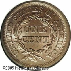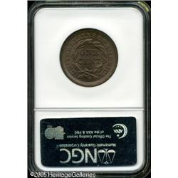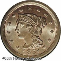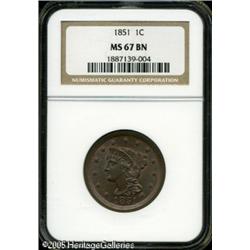 <B>1851 1C MS67 Brown NGC.</B></I> N-5, High R.2. The stars are unusually well struck on this lustrous and nearly immaculate Superb Gem. Original orange color clings to letters and devices, although rich medium brown color is predominant. Worthy of inclusion in the finest quality cabinet of early copper. Lot:5157