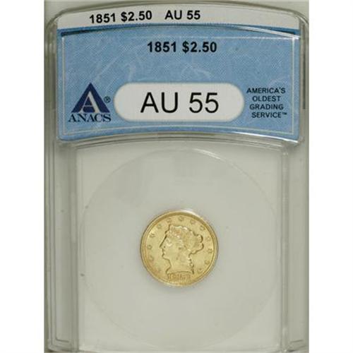 <B>1851 $2 1/2 AU55 ANACS.</B></I> NGC Census: (27/440). PCGS Population (40/193). Mintage: 1,372,748. Numismedia Wsl. Price for NGC/PCGS coin in AU55: $199. (#7759)<BR><BR><b>Shipping:</b> Coins & Currency (<a target="_blank" href="http://www.heritageauctions.com/common/shipping.php">view shipping information</a>)
