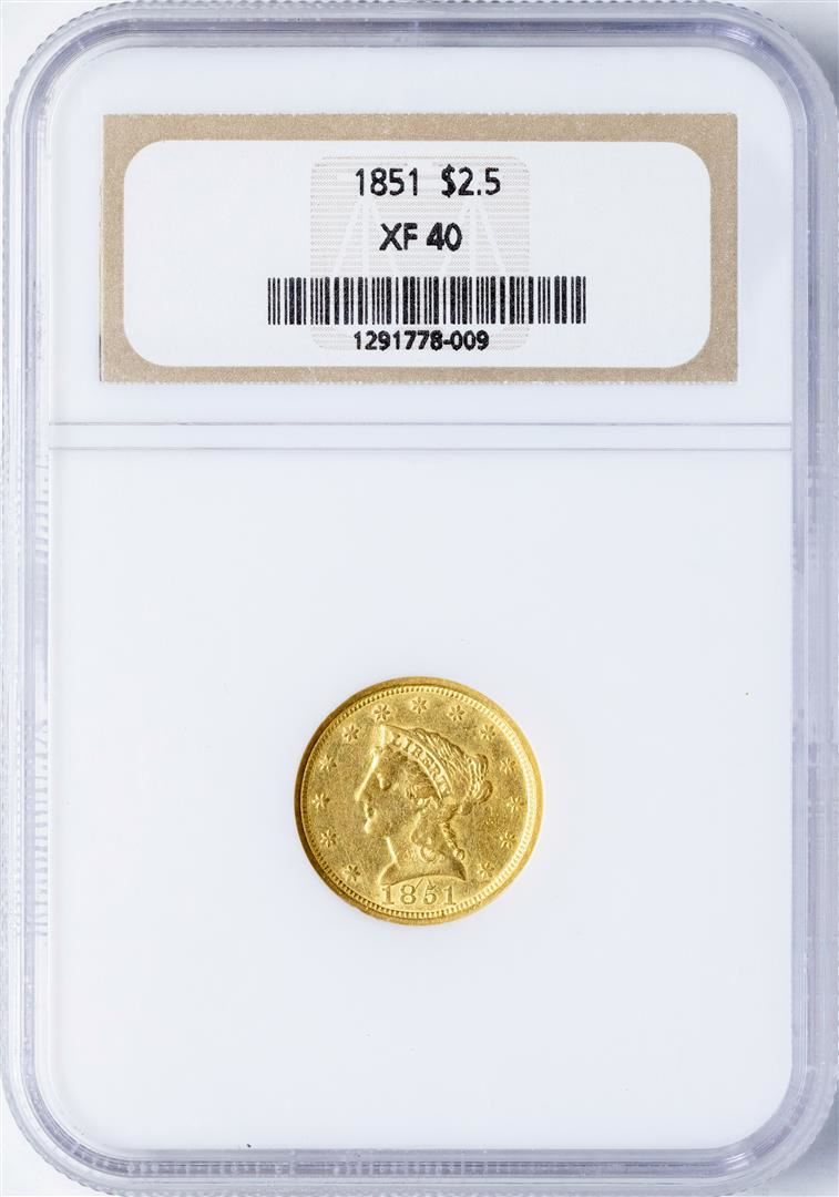 One 1851 $2 1/2 Liberty Head Quarter Eagle Gold Coin NGC XF40. NGC Certified.