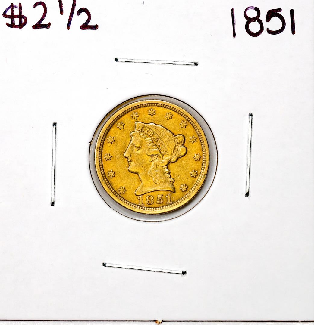 One 1851 $2 1/2 Liberty Head Quarter Eagle Gold Coin.