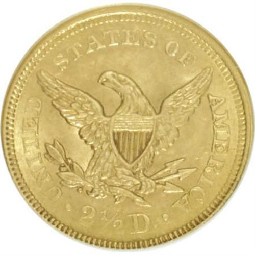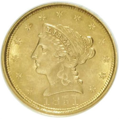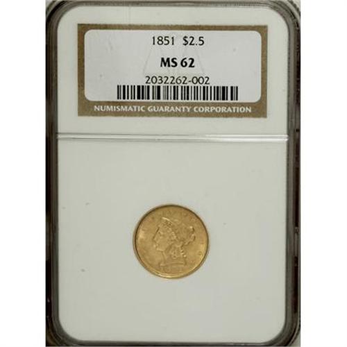 <B>1851 $2 1/2 MS62 NGC.</B></I> NGC Census: (115/88). PCGS Population (52/72). Mintage: 1,372,748. Numismedia Wsl. Price for NGC/PCGS coin in MS62: $535. (#7759)<BR><BR><B>Coin Engraver:</B> Christian Gobrecht<BR><BR><b>Shipping:</b> Coins & Currency (<a target="_blank" href="http://www.heritageauctions.com/common/shipping.php">view shipping information</a>)
