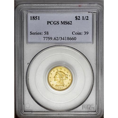 <B>1851<$2 1/2> MS62 PCGS.</B></I> Peach-gold and lime-green surfaces yield soft luster and sharply struck design elements. Minute contact marks are noted on Liberty's cheek and neck, and in the left obverse and upper reverse fields. Population: 49 in 62, 62 finer (3/06). <BR><BR><B>Important notice:</B> Heritage usually auctions material at the rate of 200-250 lots per hour. On some occasions eBay Live bid software or the Internet may not be able to keep up with the pace of the auction. We recommend placing a realistic absentee bid now as insurance to avoid disappointment. Occasionally the auctioneer may eliminate or reject an eBay Live bid, and the auctioneer may also reopen a lot after the close of the eBay live bidding (usually because we missed an audience bid), and may reject your bid even if it shows you as the winning bidder. By bidding via eBay Live, you agree that Heritage may award the lot to another bidder at its sole discretion under the circumstances described above or any other reasonable circumstances. Since eBay bids are not shown to us until we open the lot on the floor, we treat those bids just like floor bids. In most cases the floor responds before the eBay bid is presented to us, due to Internet lag time, so for consistency we have made it a policy that floor bids are always considered first over tie eBay live bids. Also please note that all Heritage lots purchased through eBay Live carry a 20% Buyer's Premium. Please make sure you read the Terms and Conditions before you bid. This lot is being auctioned in conjunction with a live floor auction by Heritage Galleries & Auctioneers. All final auction and invoice information will be supplied by Heritage Galleries & Auctioneers, and all other information should be considered preliminary. Lot:2381 <BR><BR><B>Winning Notification and Billing:</B> After the FINAL session in this auction is complete, Heritage will send e-mail and snail mail invoices. This process normally takes several days. All final auction and invoice information will be supplied by Heritage Galleries & Auctioneers, and all other information should be considered preliminary. <BR><BR>This auction will be conducted on a live auction floor and over the Internet through eBay Live. If you choose to place an absentee bid, please take a moment to <font color='#0000ff'><u><a href='http://pages.ebay.com/liveauctions/help/before/laabsentee.html'>learn how eBay Live absentee bidding works</a></u></font><font color='#000000'>