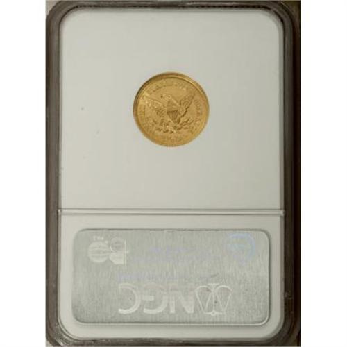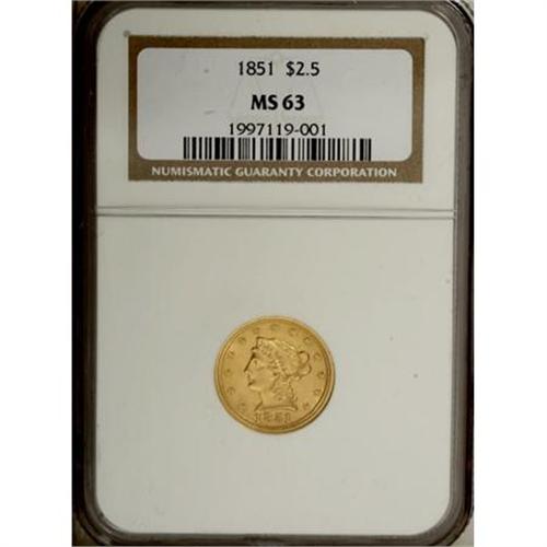 <B>1851 $2 1/2 MS63 NGC.</B></I> A crisply struck yellow-gold example that shows faint hints of green, strongly suggestive of a California origin for the metal used to strike this quarter eagle. Light marks on and around the portrait are consistent with the Select designation. Census: 56 in 63, 33 finer (12/07).<BR><BR><B>Coin Engraver:</B> Christian Gobrecht<BR><BR><b>Shipping:</b> Coins & Currency (<a target="_blank" href="http://www.heritageauctions.com/common/shipping.php">view shipping information</a>)