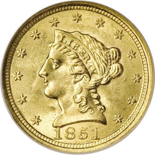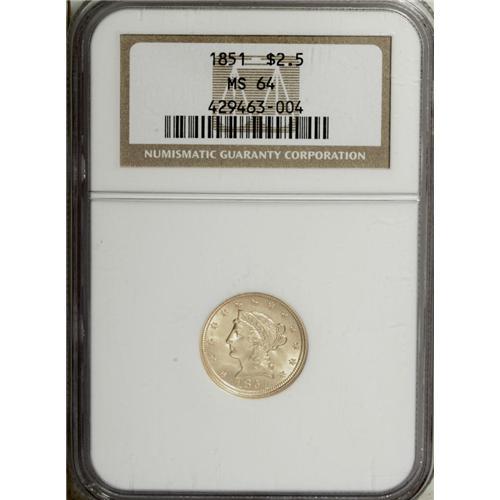 <B>1851 $2 1/2 MS64 NGC.</B></I> An outstanding example of an early quarter eagle. This example has an abundance of luster and is light yellow-gold in color. A particular strong strike brings up the details to a level rarely seen of a coin from this era. They were widely circulated, making a high end mint state coin relatively scarce. Census: 27 in 64, 7 finer (12/06).<BR><BR><b>Shipping:</b> Coin/Currency (<a target="_blank" href="http://www.heritageauctions.com/common/shipping.php">view shipping information</a>)