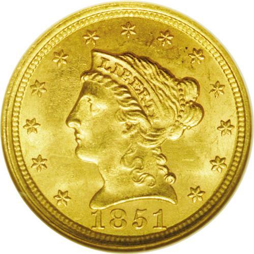 1851 $2 1/2 MS64 NGC. The lustrous, copper-gold surfac 1851[$2 1/2] MS64 NGC.
