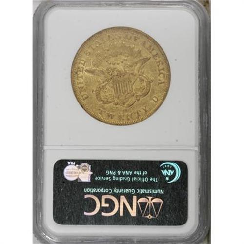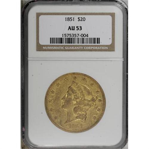 <B>1851 $20 AU53 NGC.</B></I> A moderately abraded green-gold twenty with the undipped "dirty gold" appearance valued by specialists. The 1851 is surprisingly scarce in Mint State, despite a production of more than 2 million pieces.<BR><BR><b>Shipping:</b> Coins & Currency (<a target="_blank" href="http://www.heritageauctions.com/common/shipping.php">view shipping information</a>)