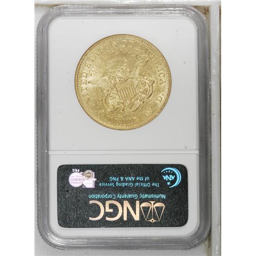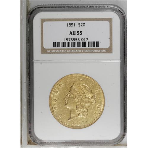 <B>1851 $20 AU55 NGC.</B></I> Shimmering luster outlines the stars, legends, and device outlines. Small obverse marks are distributed, but none require singular mention. Mintages at Philadelphia were high in 1851 and 1852 due to a large influx of California-mined gold.<BR><BR><b>Shipping:</b> Coins & Currency (<a target="_blank" href="http://www.heritageauctions.com/common/shipping.php">view shipping information</a>)