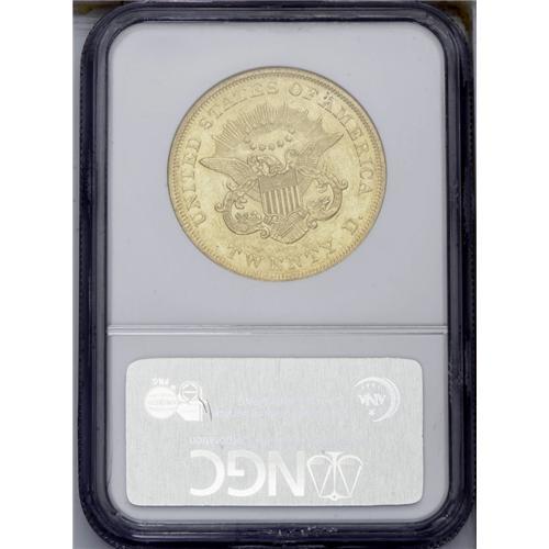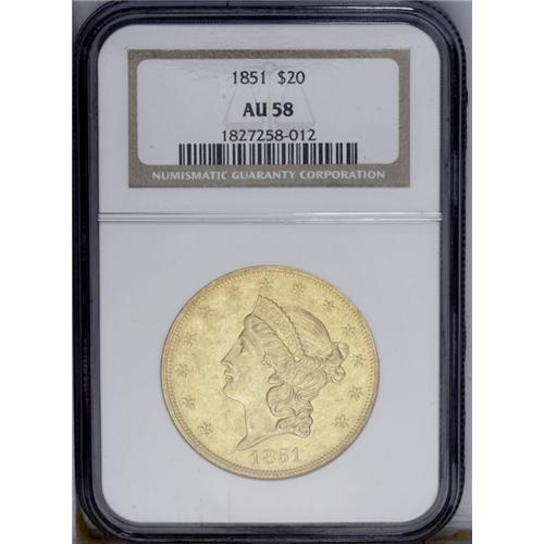 <B>1851 $20 AU58 NGC.</B></I> Alluring lime-green coloration covers each side of this sharply detailed near-Mint survivor. Highpoint wear is negligible, and abrasions seem non-existent, but wispy hairlines are evident in the obverse and reverse fields. One of the more affordable Type One double eagles in AU.