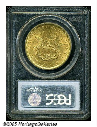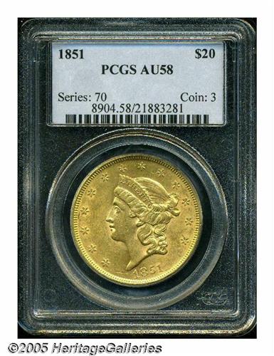 <B>1851<$20> AU58 PCGS.</B></I> Well struck with rich color and mildly frosty luster. Traces of wear are evident on the eagle's wingtips, and both sides of the piece have a few noticeable abrasions in the fields. Although more than 2 million pieces were struck, near-Mint survivors are nonetheless scarce. Population: 26 in 58, 75 finer (4/05).