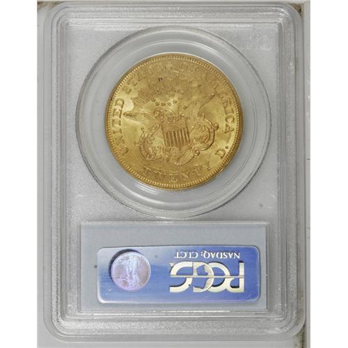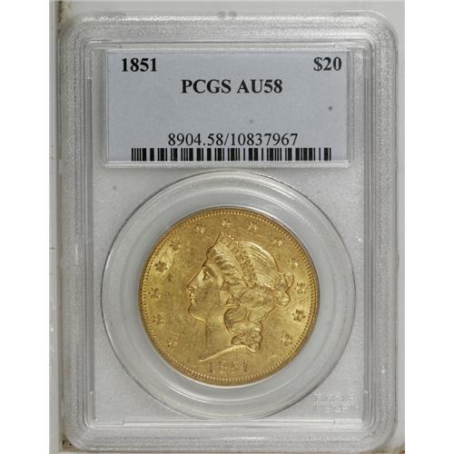 <B>1851 $20 AU58 PCGS.</B></I> Yellow-orange with a touch of forest-green in the fields. This early double eagle is well struck with significant original luster. Minor highpoint friction accounts for the grade.<BR><BR><b>Shipping:</b> Coin/Currency (<a target="_blank" href="http://www.heritageauctions.com/common/shipping.php">view shipping information</a>)