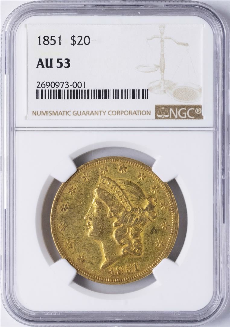 One 1851 $20 Liberty Head Double Eagle Gold Coin NGC AU53. NGC Certified.