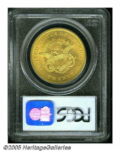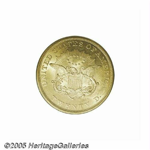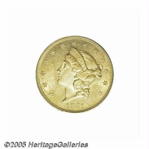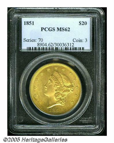 <B>1851<$20> MS62 PCGS.</B></I> The 1851 is an early double eagle that has been generally overlooked by collectors. Of the more than two million pieces that were produced, only a tiny percentage were set aside in new grades and still survive as such today. An estimated 70-80 pieces are believed extant in all grades of Uncirculated today. Of the Uncirculated coins that are known, few examples are graded finer than the present piece. This is a well struck coin that has lovely, original, subtly variegated coloration and smooth mint luster. A few light luster grazes and small marks account for the grade, but the coin appears much finer than the stated grade. Population: 30 in 62, 15 finer (6/05).