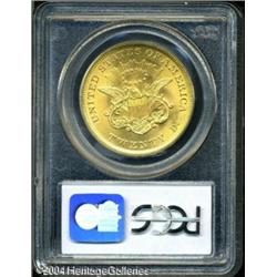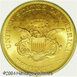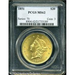 1851 $20 MS62 PCGS. This razor sharp representativ <B>1851 $20 MS62 PCGS.</B></I> This razor sharp representative is essentially full in striking detail from rim to rim. Both sides are satiny in finish with fields that glow at direct angles. Bright yellow-gold overtones are also evident as the surfaces dip into the light, but the dominant color is a rich green-gold shade. Neither side is abrasion-free, as befits the grade, but, then again, they are uncommonly distraction-free for the MS62 level. This issue's original mintage is the highest in the Liberty Double Eagle series until 1861. While circulated examples are expectantly common, Uncirculated representatives are more elusive than most collectors realize. Population: 32 in 62, 15 finer (11/04). <BR><BR><B>Important notice:</B> Heritage usually auctions material at the rate of 200-250 lots per hour. On some occasions eBay Live bid software or the Internet may not be able to keep up with the pace of the auction. We recommend placing a realistic absentee bid now as insurance to avoid disappointment. Occasionally the auctioneer may eliminate or reject an eBay Live bid, and the auctioneer may also reopen a lot after the close of the eBay live bidding (usually because we missed an audience bid), and may reject your bid even if it shows you as the winning bidder. By bidding via eBay Live, you agree that Heritage may award the lot to another bidder at its sole discretion under the circumstances described above or any other reasonable circumstances. Since eBay bids are not shown to us until we open the lot on the floor, we treat those bids just like floor bids. In most cases the floor responds before the eBay bid is presented to us, due to Internet lag time, so for consistency we have made it a policy that floor bids are always considered first over tie eBay live bids. Also please note that all Heritage lots purchased through eBay Live carry a 20% Buyer's Premium. Please make sure you read the Terms and Conditions before you bid. This lot is being auctioned in conjunction with a live floor auction by Heritage Galleries & Auctioneers. All final auction and invoice information will be supplied by Heritage Galleries & Auctioneers, and all other information should be considered preliminary. Lot:6833