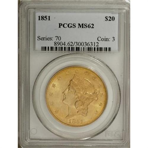 <B>1851 $20 MS62 PCGS.</B></I> Garrett and Guth (2006) note that the 1851 is an early double eagle that has been generally overlooked by collectors. Of the more than two million pieces that were produced, only a tiny percentage were set aside in new grades and still survive as such today. Its status as a Philadelphia issue and its comparatively high mintage, however, combine to disguise its elusive nature.<BR> This is a well struck example that offers original, subtly variegated apricot-gold and butter-yellow surfaces. The overall appearance is much better than the MS62 designation might suggest, though a number of fine abrasions are present in the fields. Still, a pleasing representative of this challenging issue. Population: 33 in 62, 14 finer (12/07).<BR><BR><B>Coin Engraver:</B> James B. Longacre<BR><BR><b>Shipping:</b> Coins & Currency (<a target="_blank" href="http://www.heritageauctions.com/common/shipping.php">view shipping information</a>)