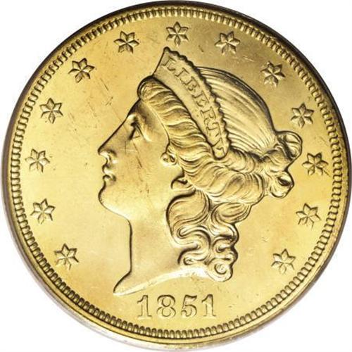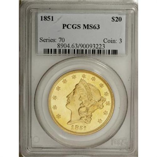 <B>1851 $20 MS63 PCGS.</B></I> Though the 1851 double eagle has the highest mintage for the denomination in its decade, that heavy production did not translate into modern-day availability. Garrett and Guth (2006) note that despite the ample original population, " ... the vast majority of 1851 double eagles did not survive. Of the coins seen today, most are heavily worn."<BR> The present piece is a wonderful exception, and its Select grade designation does not do justice to its amazing visual appeal. The fields, shining sun-gold with elements of orange at the margins, gleam with mild reflectivity; heavy die polish on the reverse is suggestive. The strike is bold by the standards of the issue. Wispy flaws are present around the portrait, and a long, thin mark slants diagonally across the bridge of Liberty's nose and extends into the cheek. Still, this is a gorgeous exemplar that should come to rest in a high-caliber collection.<BR><I>From The New York Eye Appeal Collection, Part Three.</B></I><BR><BR><B>Coin Engraver:</B> James B. Longacre<BR><BR><b>Shipping:</b> Coins & Currency (<a target="_blank" href="http://www.heritageauctions.com/common/shipping.php">view shipping information</a>)