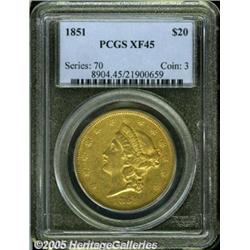 <B>1851 $20 XF45 PCGS.</B></I> A golden-brown and olive example of this early Double Eagle issue. Nicely struck, and the obverse is problem-free. A bright mark above the Y in TWENTY is mentioned for accuracy.