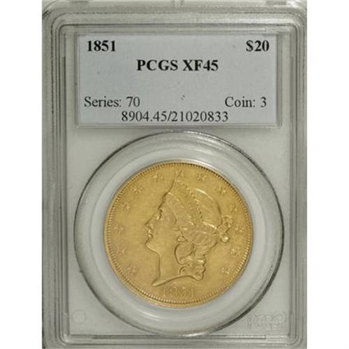<B>1851 $20 XF45 PCGS.</B></I> PCGS Population (82/253). NGC Census: (136/451). Mintage: 2,087,155. Numismedia Wsl. Price for NGC/PCGS coin in XF45: $749. (#8904)<BR><BR><B>Coin Engraver:</B> James B. Longacre<BR><BR><b>Shipping:</b> Coins & Currency (<a target="_blank" href="http://www.heritageauctions.com/common/shipping.php">view shipping information</a>\)