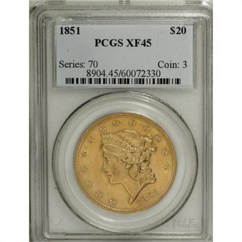 <B>1851 $20 XF45 PCGS.</B></I> Extensively, but not heavily abraded, with nearly enough luster to qualify as an AU. Only slightly worn, and showing very deep coloration. A scarcer issue. <BR><BR><B>Coin Engraver:</B> James B. Longacre<BR><BR><b>Shipping:</b> Coins & Currency (<a target="_blank" href="http://www.heritageauctions.com/common/shipping.php">view shipping information</a>)