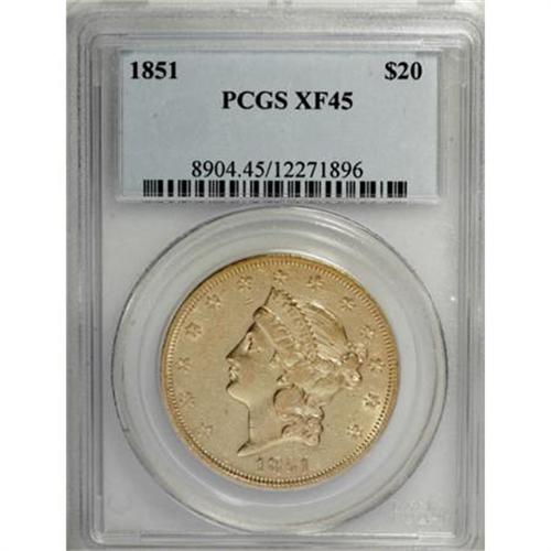 <B>1851 $20 XF45 PCGS.</B></I> A bright green-gold twenty with lots of flash and brilliance. Very well-detailed for the grade. If placed in a line-up with other XF45 1851 Liberty double eagles, this example would stand out in terms of beauty.<BR><I>From The Casa Becca del Norté Collection.</B></I><BR><BR><B>Coin Engraver:</B> James B. Longacre<BR><BR><b>Shipping:</b> Coins & Currency (<a target="_blank" href="http://www.heritageauctions.com/common/shipping.php">view shipping information</a>)