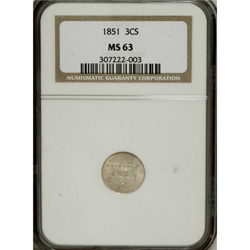 <B>1851 3CS MS63 NGC.</B></I> NGC Census: (218/586). PCGS Population (276/566). Mintage: 5,447,400. Numismedia Wsl. Price for NGC/PCGS coin in MS63: $240. (#3664)<BR><BR><b>Shipping:</b> Coins & Currency (<a target="_blank" href="http://www.heritageauctions.com/common/shipping.php">view shipping information</a>)
