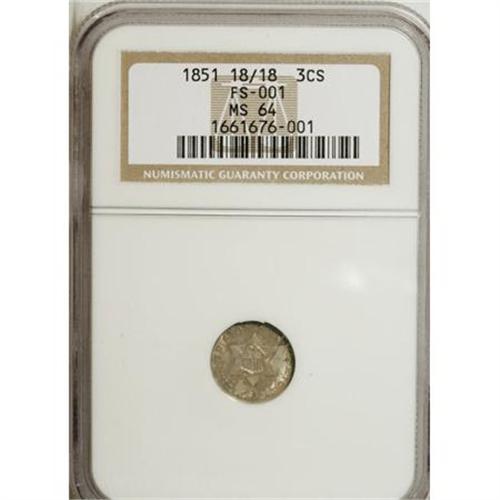 <B>1851 3CS 18/18 MS64 NGC.</B></I> FS-001. NGC Census: (363/227). PCGS Population (309/257). Mintage: 5,447,400. Numismedia Wsl. Price for NGC/PCGS coin in MS64: $380. (#3664)<BR><BR><b>Shipping:</b> Coins & Currency (<a target="_blank" href="http://www.heritageauctions.com/common/shipping.php">view shipping information</a>)