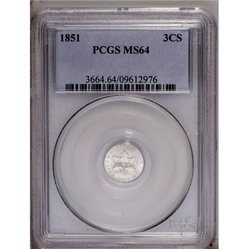 1851 3CS MS64 PCGS. Untoned with a bright, satiny fini