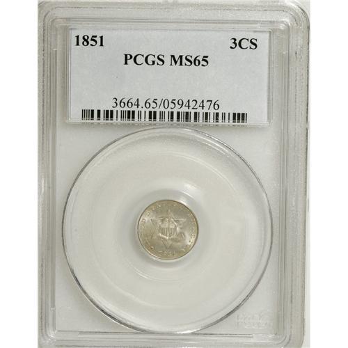 <B>1851 3CS MS65 PCGS.</B></I> Pastel blues and golds grace each side of this lustrous Gem first-year issue, from a generous mintage exceeding 5.4 million pieces. A nice, problem-free Type One coin for the grade.<BR><BR><b>Shipping:</b> Coins & Currency (<a target="_blank" href="http://www.heritageauctions.com/common/shipping.php">view shipping information</a>)