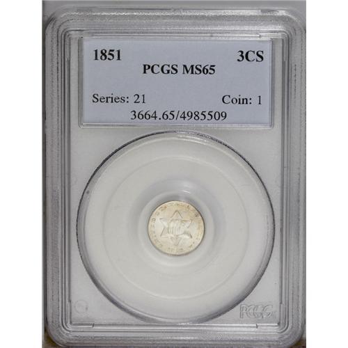 <B>1851<3CS> MS65 PCGS.</B></I> The strike is above average for the issue on this well preserved trime. Golden-gray patina shows a blush or two of powder-blue. <BR><BR><B>Important notice:</B> Heritage usually auctions material at the rate of 200-250 lots per hour. On some occasions eBay Live bid software or the Internet may not be able to keep up with the pace of the auction. We recommend placing a realistic absentee bid now as insurance to avoid disappointment. Occasionally the auctioneer may eliminate or reject an eBay Live bid, and the auctioneer may also reopen a lot after the close of the eBay live bidding (usually because we missed an audience bid), and may reject your bid even if it shows you as the winning bidder. By bidding via eBay Live, you agree that Heritage may award the lot to another bidder at its sole discretion under the circumstances described above or any other reasonable circumstances. Since eBay bids are not shown to us until we open the lot on the floor, we treat those bids just like floor bids. In most cases the floor responds before the eBay bid is presented to us, due to Internet lag time, so for consistency we have made it a policy that floor bids are always considered first over tie eBay live bids. Also please note that all Heritage lots purchased through eBay Live carry a 20% Buyer's Premium. Please make sure you read the Terms and Conditions before you bid. This lot is being auctioned in conjunction with a live floor auction by Heritage Galleries & Auctioneers. All final auction and invoice information will be supplied by Heritage Galleries & Auctioneers, and all other information should be considered preliminary. Lot:753 <BR><BR><B>Winning Notification and Billing:</B> After the FINAL session in this auction is complete, Heritage will send e-mail and snail mail invoices. This process normally takes several days. All final auction and invoice information will be supplied by Heritage Galleries & Auctioneers, and all other information should be considered preliminary. <BR><BR>This auction will be conducted on a live auction floor and over the Internet through eBay Live. If you choose to place an absentee bid, please take a moment to <font color='#0000ff'><u><a href='http://pages.ebay.com/liveauctions/help/before/laabsentee.html'>learn how eBay Live absentee bidding works</a></u></font><font color='#000000'>