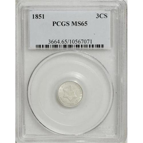 <B>1851 3CS MS65 PCGS.</B></I> This trime has lustrous surfaces lightly dusted with powder-blue patina. A pleasing example with only minuscule marks that possesses all the necessary attributes of a Gem. <BR><BR><B>Coin Engraver:</B> James B. Longacre<BR><BR><b>Shipping:</b> Coins & Currency (<a target="_blank" href="http://www.heritageauctions.com/common/shipping.php">view shipping information</a>)