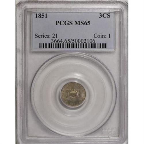 <B>1851 3CS MS65 PCGS.</B></I> Light gold and sea-green patina over lustrous and lovely surfaces. A touch of softness is present on the central devices, but the overall preservation is excellent.<BR><BR><B>Coin Engraver:</B> James B. Longacre<BR><BR><b>Shipping:</b> Coins & Currency (<a target="_blank" href="http://www.heritageauctions.com/common/shipping.php">view shipping information</a>)
