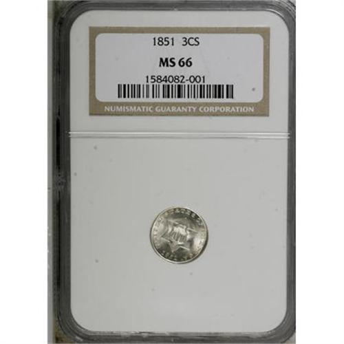 <B>1851 3CS MS66 NGC.</B></I> Lustrous silver-gray surfaces reveal traces of light gold color at the margins. Well struck, with no significant marks. Census: 66 in 66, 8 finer (1/08).<BR><BR><B>Coin Engraver:</B> James B. Longacre<BR><BR><b>Shipping:</b> Coins & Currency (<a target="_blank" href="http://www.heritageauctions.com/common/shipping.php">view shipping information</a>)