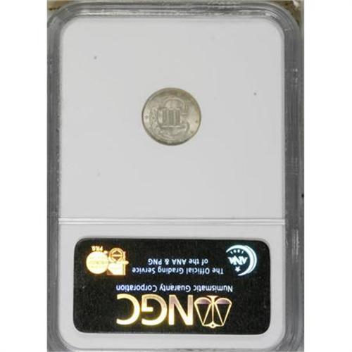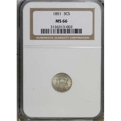 <B>1851 3CS MS66 NGC.</B></I> A satiny and elegant Premium Gem representative of this first-year trime issue, well-defined with occasional green-gold tints against the otherwise silver-gray surfaces. NGC has graded only eight numerically finer pieces (2/08).<BR><BR><B>Coin Engraver:</B> James B. Longacre<BR><BR><b>Shipping:</b> Coins & Currency (<a target="_blank" href="http://www.heritageauctions.com/common/shipping.php">view shipping information</a>)