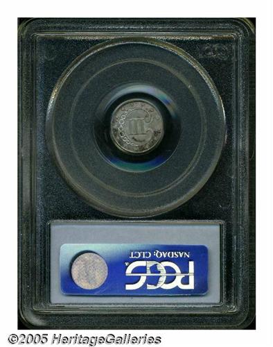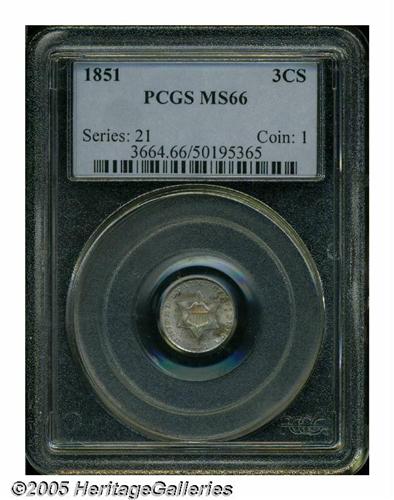 <B>1851<3CS> MS66 PCGS.</B></I> Splashes of rose, yellow, violet, charcoal, and ice-blue visit lustrous surfaces. The design features are well impressed throughout, and there are no mentionable marks to report. Three Cent Silvers were important in commerce prior to 1853, since higher denomination silver coins were driven out of circulation by an influx of California-mined gold. Population: 80 in 66, 11 finer (5/05).
