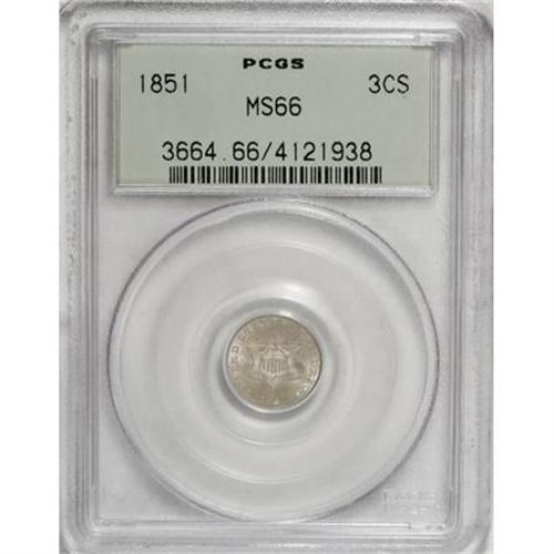 <B>1851 3CS MS66 PCGS.</B></I> This gently shimmering cream-gray and lime-gold Premium Gem is both unabraded and crisply struck. A charming example of this first-year issue. Encapsulated in an old green label holder.<BR><BR><B>Coin Engraver:</B> James B. Longacre<BR><BR><b>Shipping:</b> Coins & Currency (<a target="_blank" href="http://www.heritageauctions.com/common/shipping.php">view shipping information</a>\)