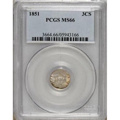 <B>1851 3CS MS66 PCGS.</B></I> A satiny and carefully preserved example of this first-year issue, pearl-gray with a touch of lavender in the centers and rich purple-red and green toning near the peripheries. PCGS has graded only 11 pieces finer (7/07). <BR><BR><B>Coin Engraver:</B> James B. Longacre<BR><BR><b>Shipping:</b> Coins & Currency (<a target="_blank" href="http://www.heritageauctions.com/common/shipping.php">view shipping information</a>)