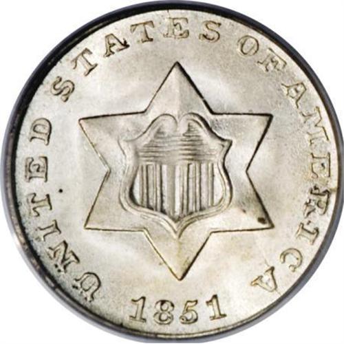 <B>1851 3CS MS67 PCGS.</B></I> Ex: Larry Shapiro. A stellar representative of this smallest silver denomination officially issued by the United States. Well struck with frosty surfaces that are bright, untoned, and silver-white. A great candidate for the strongest of 19th century type sets. Population: 11 in 67, 0 finer (1/08).<BR><BR><B>Coin Engraver:</B> James B. Longacre<BR><BR><b>Shipping:</b> Coins & Currency (<a target="_blank" href="http://www.heritageauctions.com/common/shipping.php">view shipping information</a>)