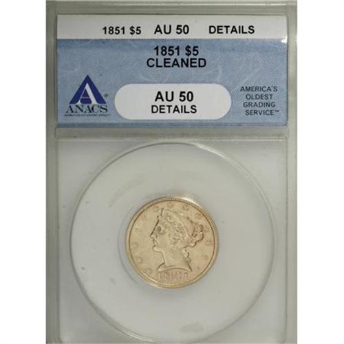 <B>1851 $5 --Cleaned--ANACS AU50 Details.</B></I> NGC Census: (29/258). PCGS Population (28/83). Mintage: 377,505. Numismedia Wsl. Price for NGC/PCGS coin in AU50: $252. (#8246)<BR><BR><B>Coin Engraver:</B> Christian Gobrecht<BR><BR><b>Shipping:</b> Coins & Currency (<a target="_blank" href="http://www.heritageauctions.com/common/shipping.php">view shipping information</a>)