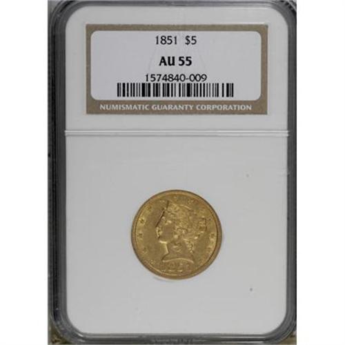 <B>1851 $5 AU55 NGC.</B></I> . NGC Census: (59/157). PCGS Population (28/44). Mintage: 377,505. Numismedia Wsl. Price for NGC/PCGS coin in AU55: $360. (#8246)<BR><BR><B>Coin Engraver:</B> Christian Gobrecht<BR><BR><b>Shipping:</b> Coins & Currency (<a target="_blank" href="http://www.heritageauctions.com/common/shipping.php">view shipping information</a>)