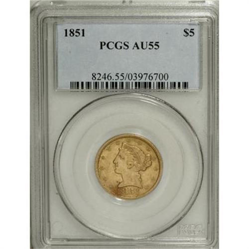 1851 $5 AU55 PCGS. PCGS Population (24/46). NGC Ce