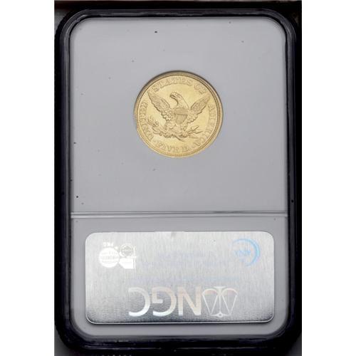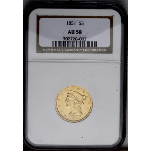 <B>1851<$5> AU58 NGC.</B></I> A nice coin for No Motto type purposes, this date is also difficult to locate Mint State. The present representative is golden-orange with traces of modest brightness in the fields. Mildly scuffy on both sides, yet well struck over all features, except for the eagle's neck feathers. Census: 79 in 58, 56 finer (3/06). <BR><BR><B>Important notice:</B> Heritage usually auctions material at the rate of 200-250 lots per hour. On some occasions eBay Live bid software or the Internet may not be able to keep up with the pace of the auction. We recommend placing a realistic absentee bid now as insurance to avoid disappointment. Occasionally the auctioneer may eliminate or reject an eBay Live bid, and the auctioneer may also reopen a lot after the close of the eBay live bidding (usually because we missed an audience bid), and may reject your bid even if it shows you as the winning bidder. By bidding via eBay Live, you agree that Heritage may award the lot to another bidder at its sole discretion under the circumstances described above or any other reasonable circumstances. Since eBay bids are not shown to us until we open the lot on the floor, we treat those bids just like floor bids. In most cases the floor responds before the eBay bid is presented to us, due to Internet lag time, so for consistency we have made it a policy that floor bids are always considered first over tie eBay live bids. Also please note that all Heritage lots purchased through eBay Live carry a 20% Buyer's Premium. Please make sure you read the Terms and Conditions before you bid. This lot is being auctioned in conjunction with a live floor auction by Heritage Galleries & Auctioneers. All final auction and invoice information will be supplied by Heritage Galleries & Auctioneers, and all other information should be considered preliminary. Lot:2705 <BR><BR><B>Winning Notification and Billing:</B> After the FINAL session in this auction is complete, Heritage will send e-mail and snail mail invoices. This process normally takes several days. All final auction and invoice information will be supplied by Heritage Galleries & Auctioneers, and all other information should be considered preliminary. <BR><BR>This auction will be conducted on a live auction floor and over the Internet through eBay Live. If you choose to place an absentee bid, please take a moment to <font color='#0000ff'><u><a href='http://pages.ebay.com/liveauctions/help/before/laabsentee.html'>learn how eBay Live absentee bidding works</a></u></font><font color='#000000'>