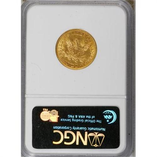 <B>1851 $5 AU58 NGC.</B></I> A crisply struck and eminently appealing near-Mint representative of this earlier Coronet half eagle issue, yellow-orange with faint, scattered abrasions. Elusive in Mint State, with just 61 such pieces graded by NGC (8/07).<BR><BR><B>Coin Engraver:</B> Christian Gobrecht<BR><BR><b>Shipping:</b> Coins & Currency (<a target="_blank" href="http://www.heritageauctions.com/common/shipping.php">view shipping information</a>)