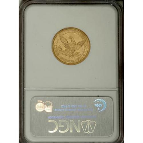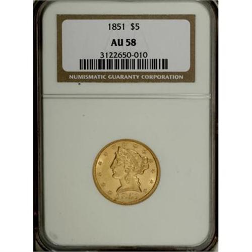 <B>1851 $5 AU58 NGC.</B></I> Sharply struck with strongly lustrous yellow-gold and sun-gold surfaces that seem unaffected by minor friction. A number of tiny abrasions and wispy marks are present on each side, but the effect on the eye appeal is minimal.<BR><BR><B>Coin Engraver:</B> Christian Gobrecht<BR><BR><b>Shipping:</b> Coins & Currency (<a target="_blank" href="http://www.heritageauctions.com/common/shipping.php">view shipping information</a>)