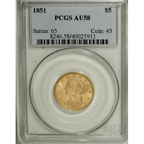 <B>1851 $5 AU58 PCGS.</B></I> Solidly struck and relatively unabraded with just a hint of highpoint rub. A wispy abrasion in the left obverse field is the only flaw of note on this yellow-gold example. Population: 18 in 58, 26 finer (2/08).<BR><BR><B>Coin Engraver:</B> Christian Gobrecht<BR><BR><b>Shipping:</b> Coins & Currency (<a target="_blank" href="http://www.heritageauctions.com/common/shipping.php">view shipping information</a>)